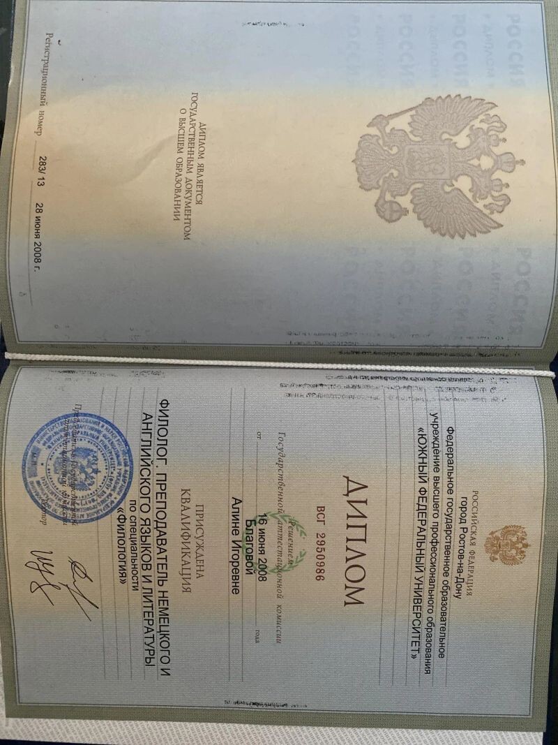 - ЮФУ, Филолог, преподаватель немецкого и английского языков, 2003–2008 гг.