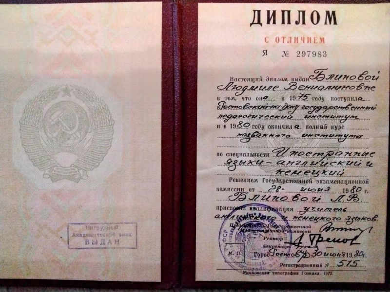 - Ростовский-на-Дону государственный педагогический институт, иностранные языки (английский и немецкий), 1975–1980 гг.