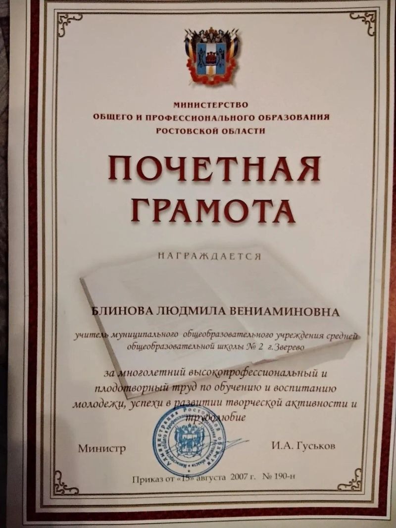 - Министерство общего и профессионального образования Ростовской области, почётная грамота, 2007 г.