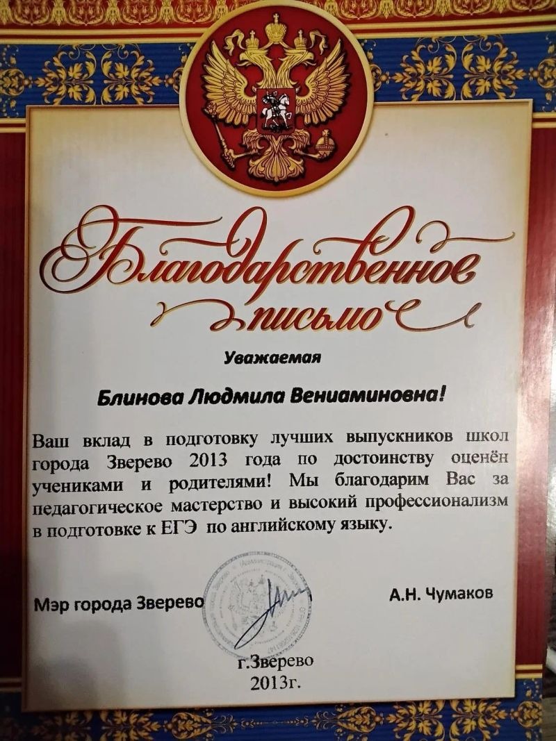 - Благодарственное письмо мэра города Зверево, 2013 г.
