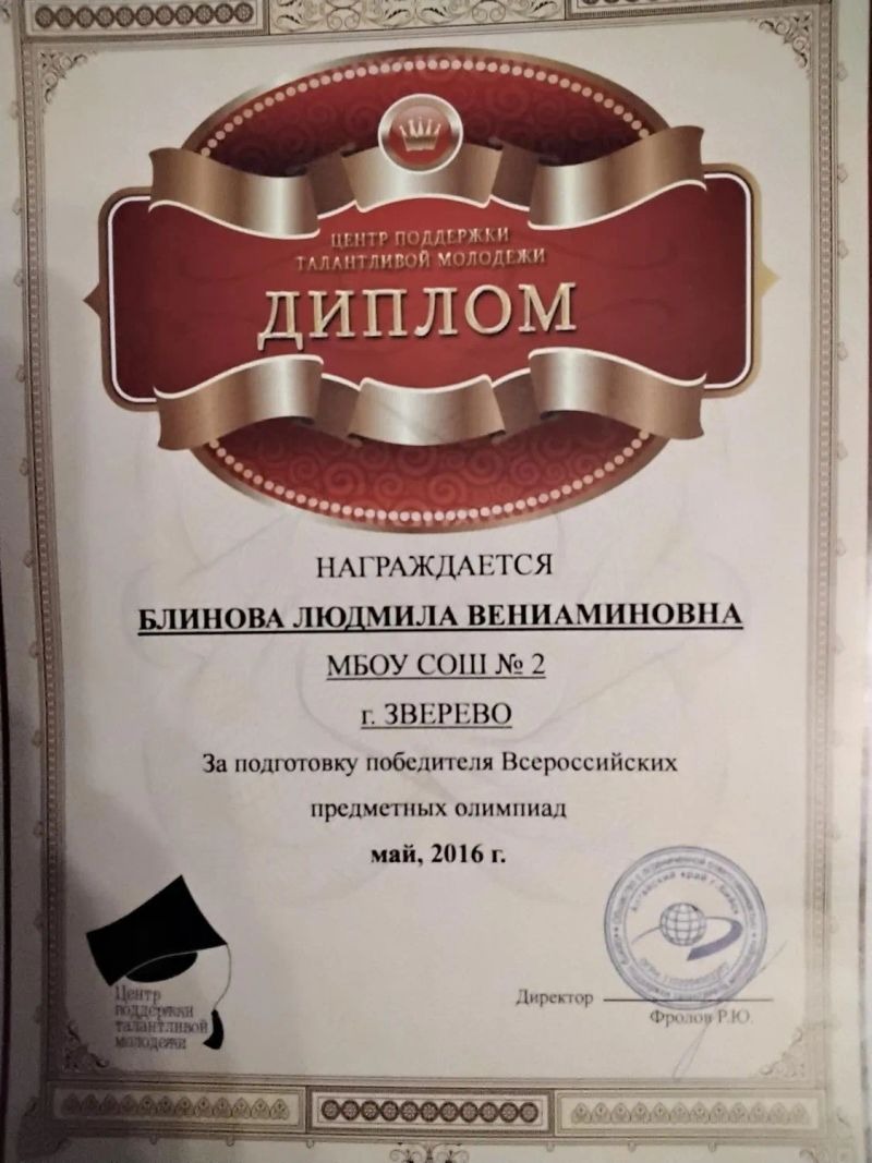 - Центр поддержки талантливой молодёжи, диплом за подготовку победителя Всероссийских предметных олимпиад, 2016 г.