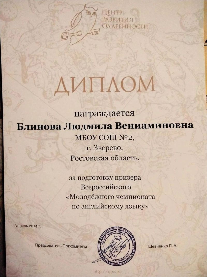 - Центр развития одарённости, диплом за подготовку призёра «Молодёжного чемпионата по английскому языку», 2014 г.