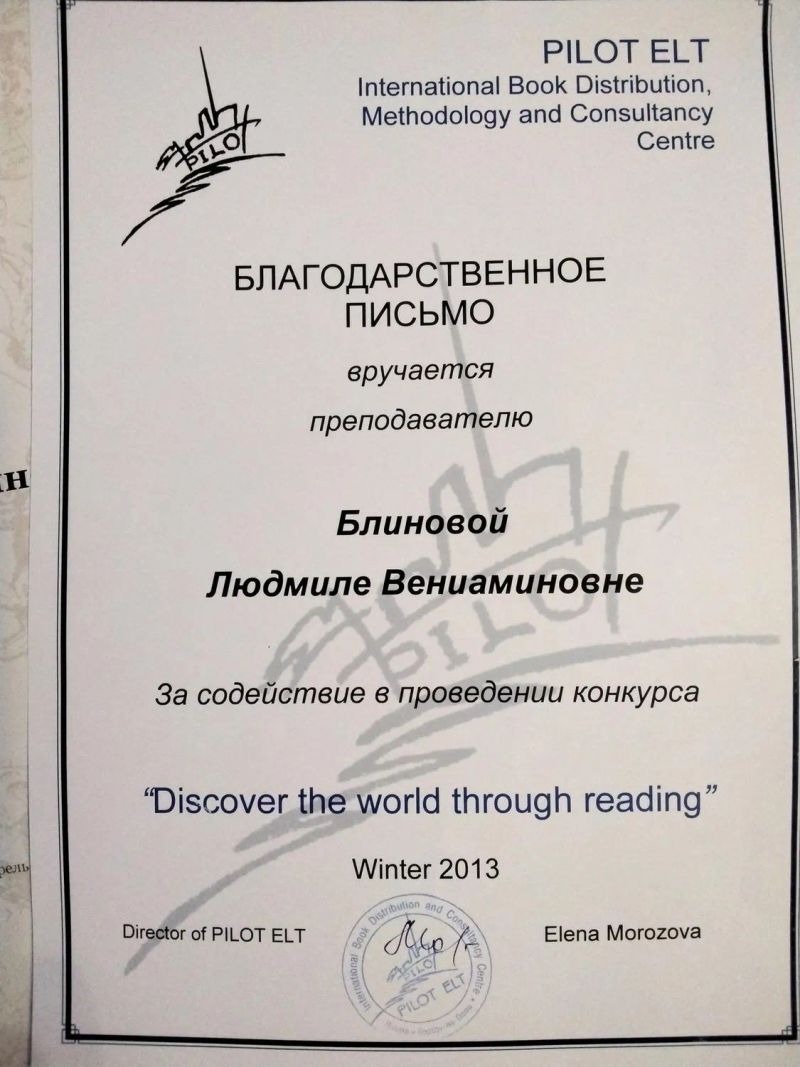 - Благодарственное письмо Methodology and Consultancy Centre PILOT ELT, 2013 г.