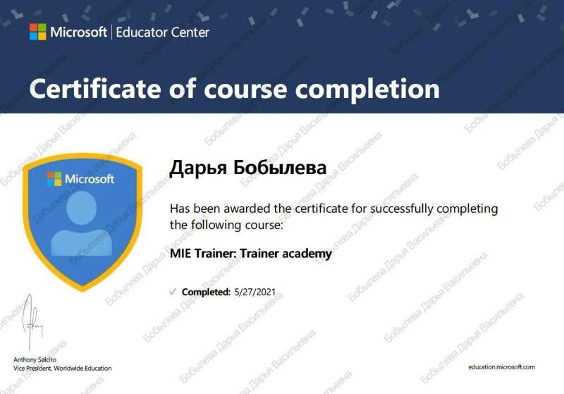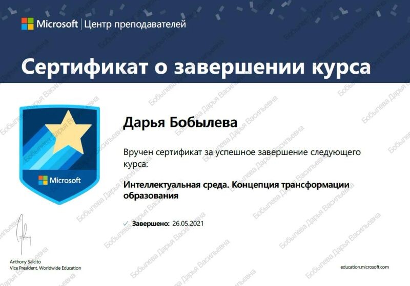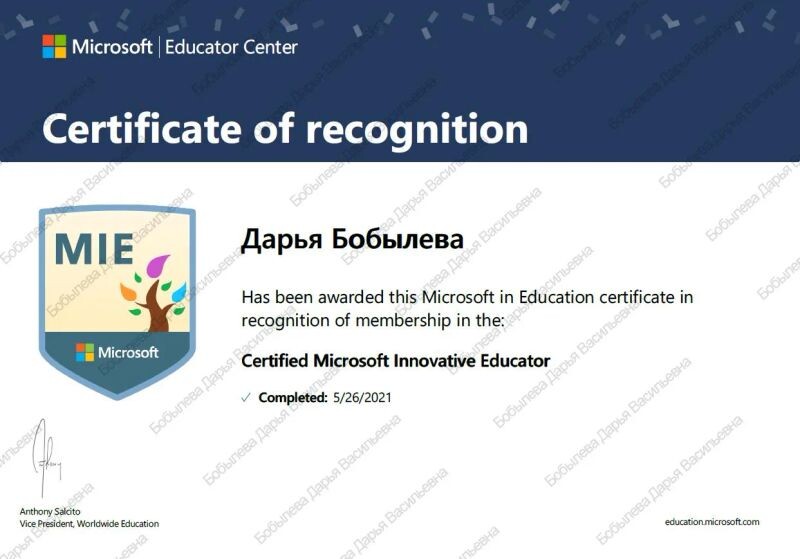 - Сертифицированный специалист Microsoft по направлению «Интеллектуальная среда. Концепция трансформации образования», 2021 г.