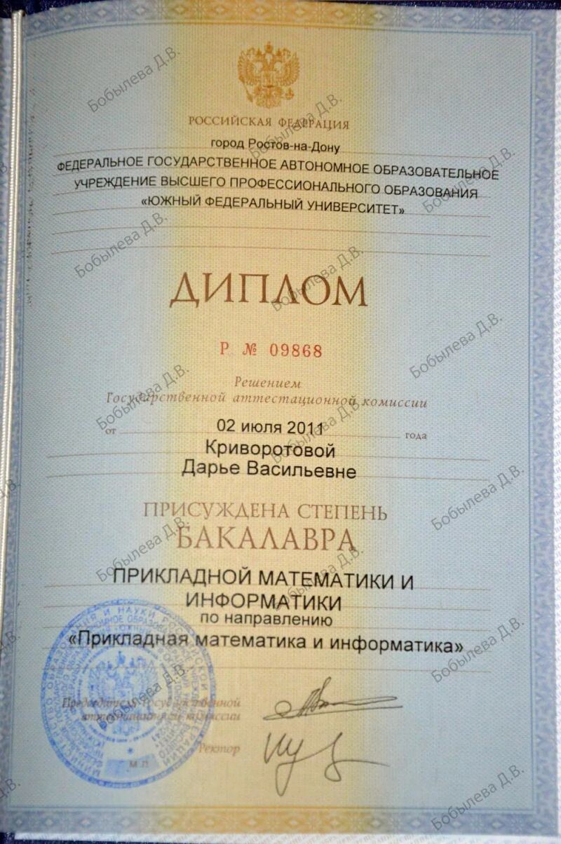 - ЮФУ, направление подготовки «Прикладная математика и информатика», бакалавр, 2007–2011 гг.