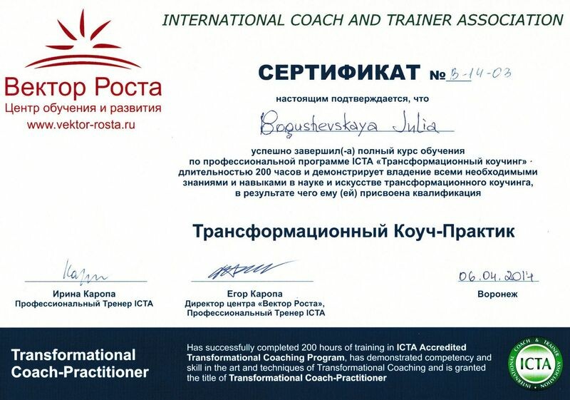 - Трансформационный коучинг INTERNATIONAL COACH AND TRAINER ASSOCIATION, 2013–2014 гг.