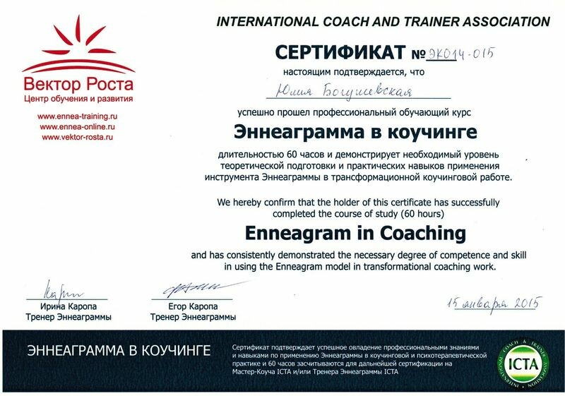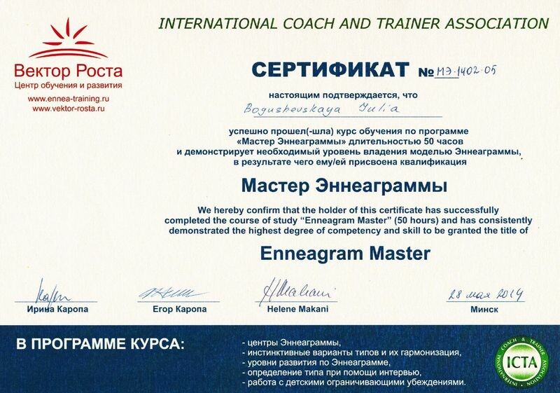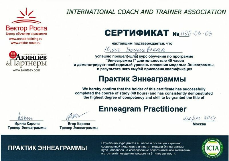 - Практик эннеаграммы, International Coach And Trainer Association, 2014 г.