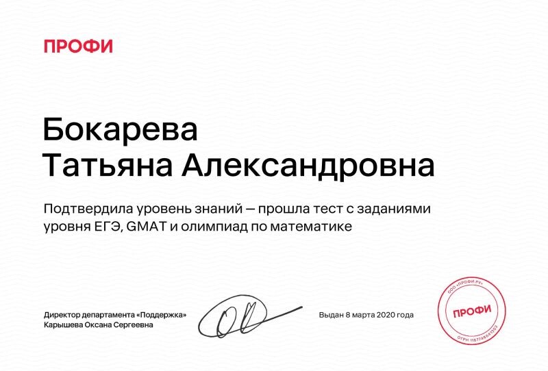 Работа с Татьяной Александровной перед ЕГЭ по математике была очень полезной для меня. Хотя мои результаты на экзамене не были идеальными, без ее помощи я бы вообще не смогла сдать ЕГЭ. Я очень довольна тем, что смогла поступить в желаемый ВУЗ. Я готовила базу самостоятельно, а Татьяна помогала мне с профилем. Уроки мы проводили у нее дома, где была отличная рабочая обстановка: просторный дом с отдельной комнатой для занятий. Все уроки были комфортными и продуктивными.
