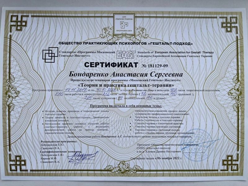 - Московский Гештальт Институт, Гештальт, 1455 часов, 2017–2022 гг.