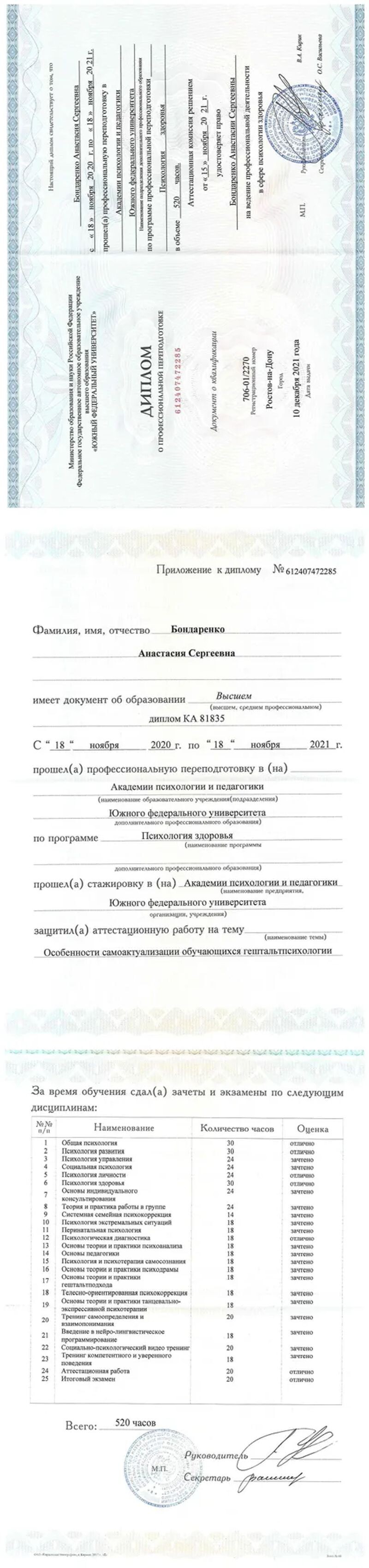 - Южный Федеральный Унивеситет, Психология Здоровья, 2019–2021 гг.