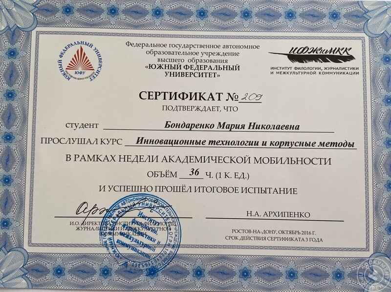 - Южный федеральный университет, педагогическое образование: русский язык и литература, 2015–2020 гг.