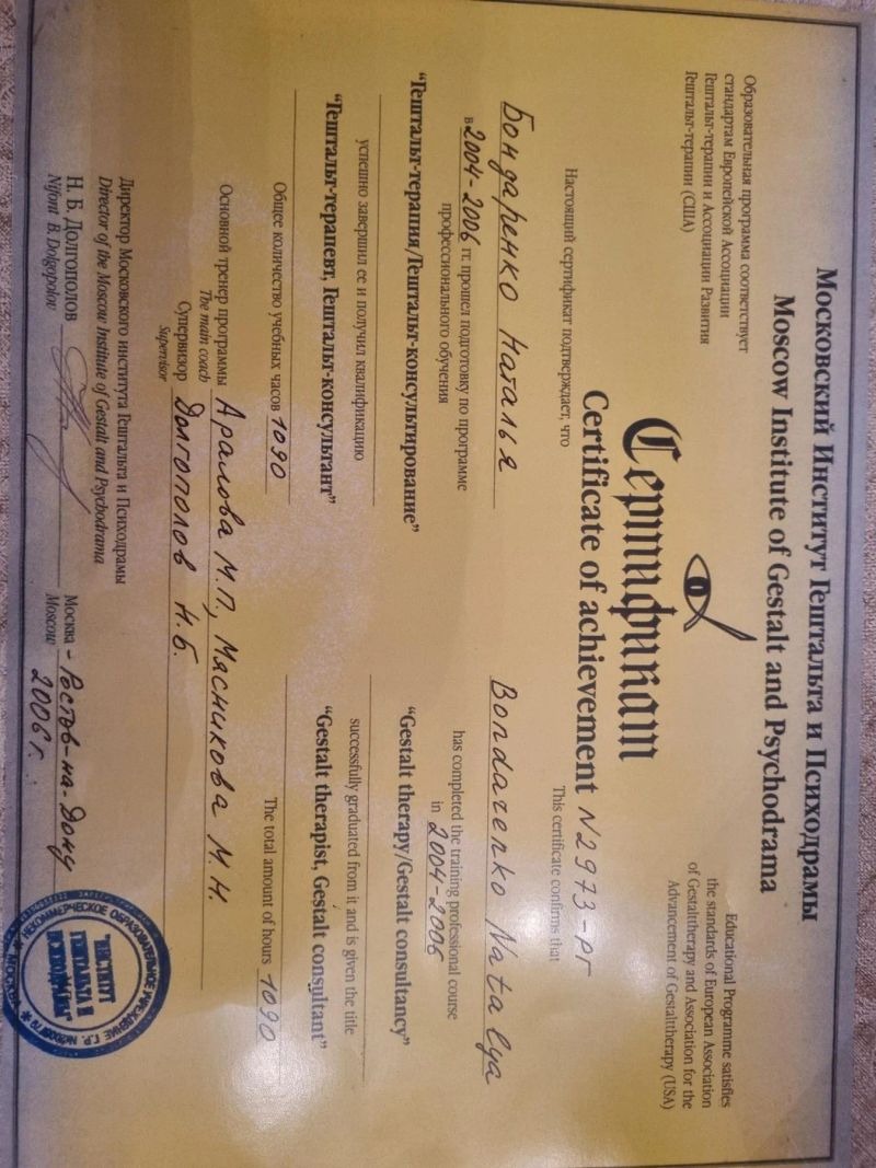- МИГИП, гештальт-терапевт, гештальт консультант, 2004–2006 гг.