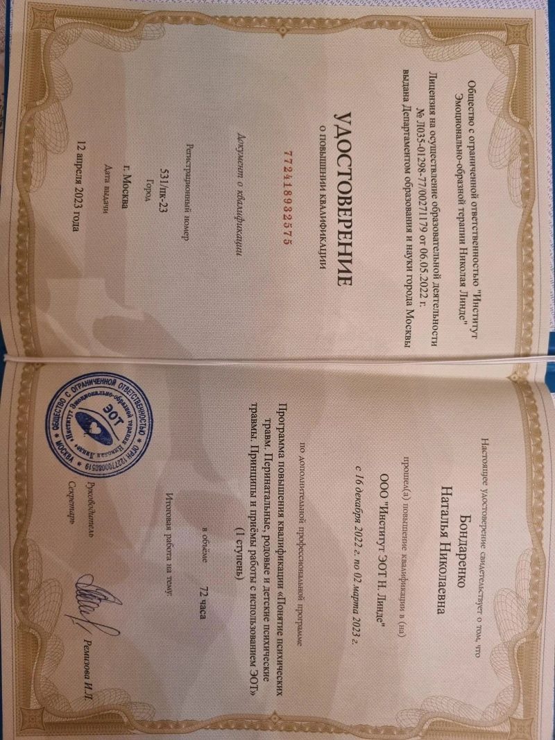 - Институт ЭОТ Н. Линде, повышение квалификации по программе «Понятие психических травм. Перинатальные, родовые и детские психические травмы. Принципы и приёмы работы с использованием ЭОТ», 2022–2023 гг.