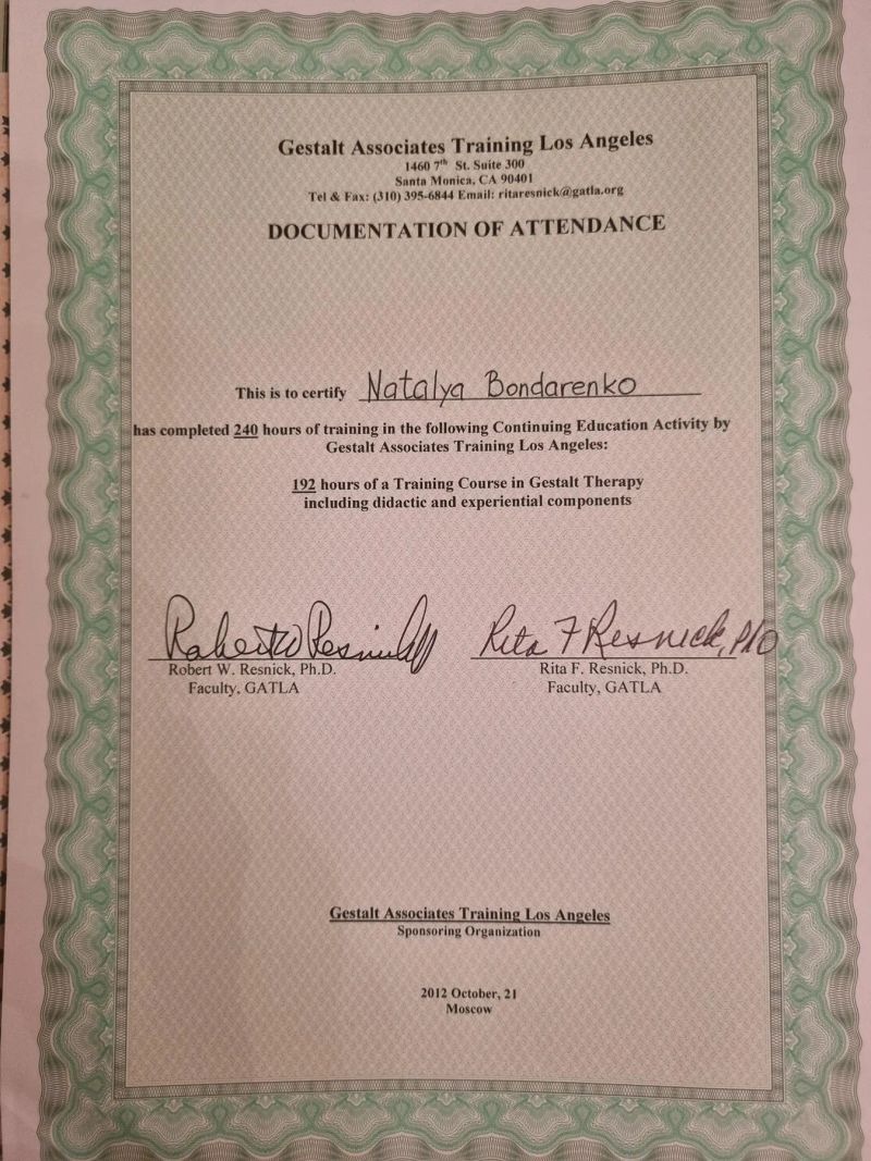 - GATLA, Training Course in Gestalt Therapy, 2012 г.