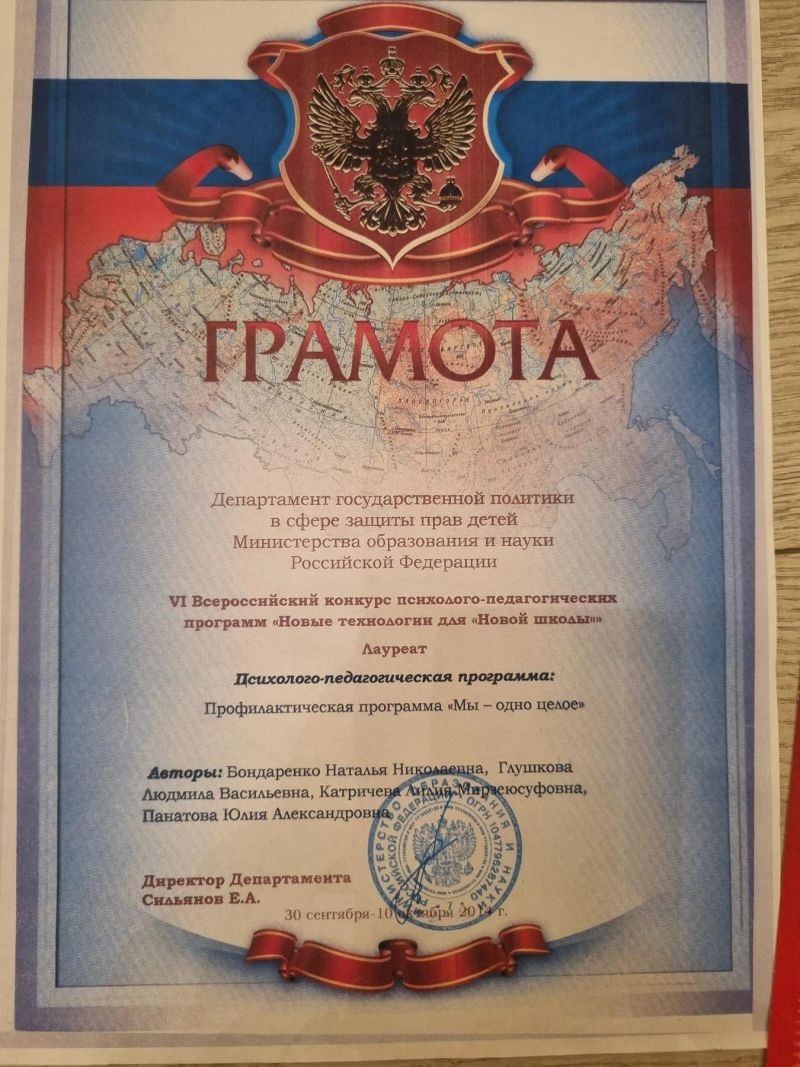 - VI Всероссийский конкурс психолого-педагогических программ «Новые технологии для «Новой школы», лауреат, 2014 г.