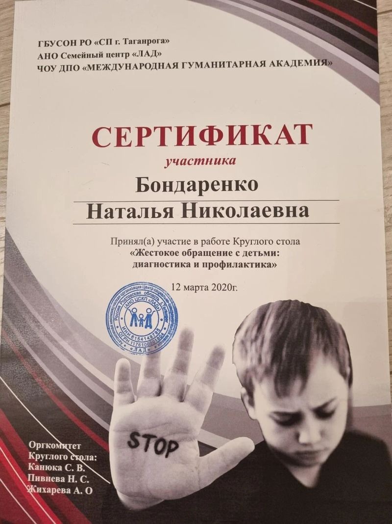 - ГБУСОН РО «СП г. Таганрога», АНО Семейный центр «ЛАД», ЧОУ ДПО «Международная гуманитарная академия», участие в работе Круглого стола «Жестокое обращение с детьми: диагностика и профилактика», 2020 г.