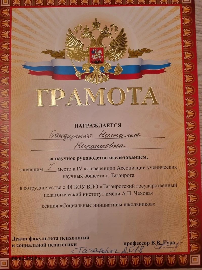 - Грамота за научное руководство исследованием, I занявшим место в IV конференции Ассоциации ученических научных обществ г. Таганрога, 2018 г.