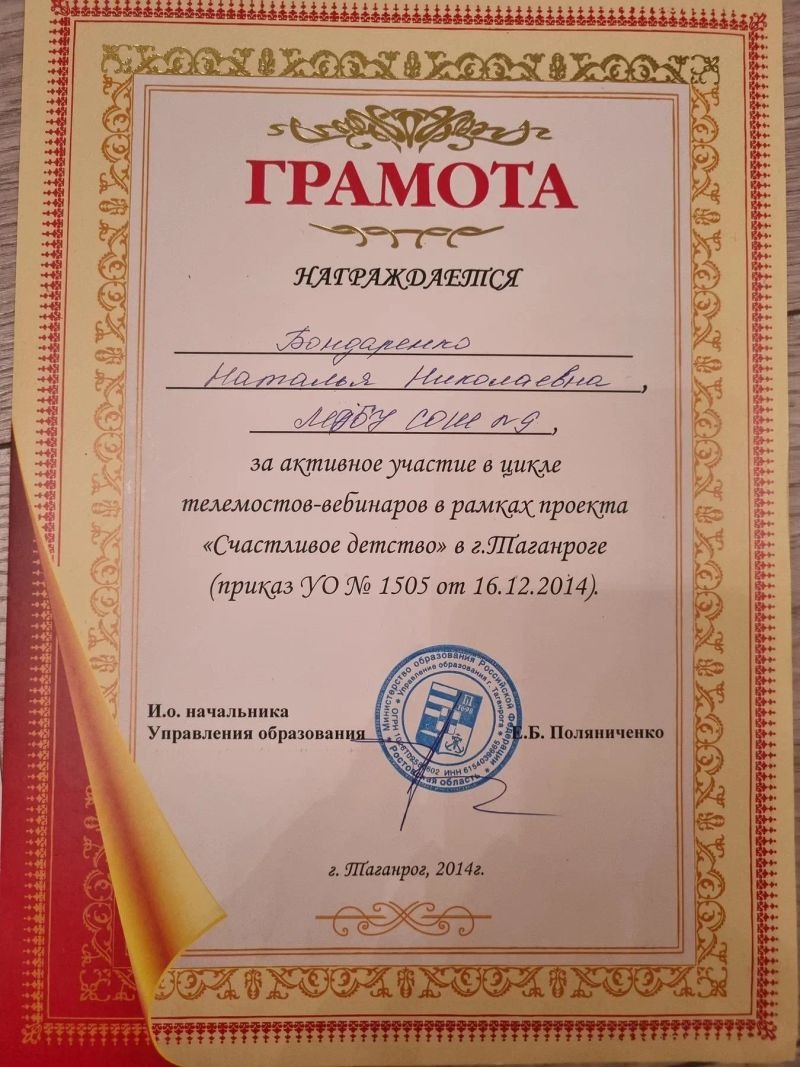 - Управления образования г. Таганрока, грамота участие в цикле телемостов-вебинаров в рамках проекта «Счастливое детство», 2014 г.