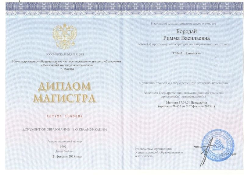- Московский институт психоанализа, психология, магистратура, 2023–2025 гг.