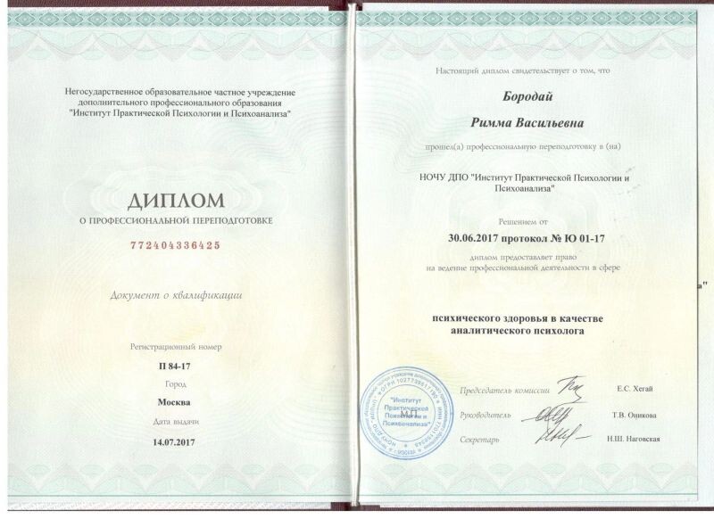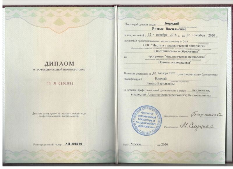 - Институт практической психологии и психоанализа, аналитический психолог, 2016–2017 гг.