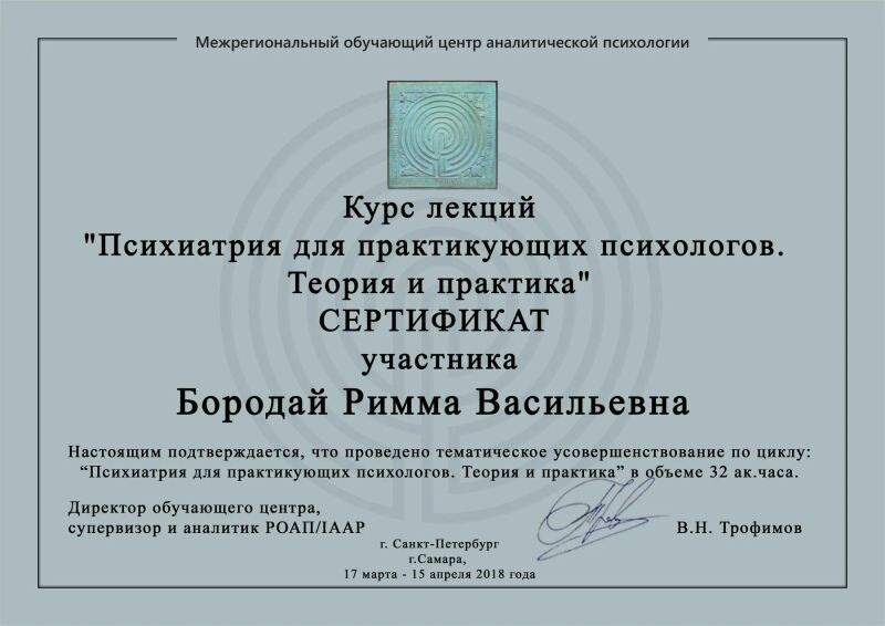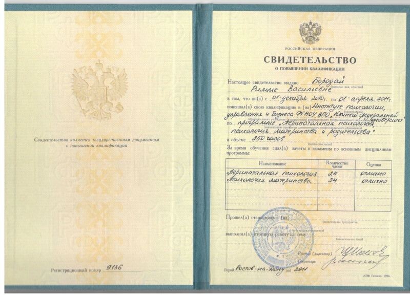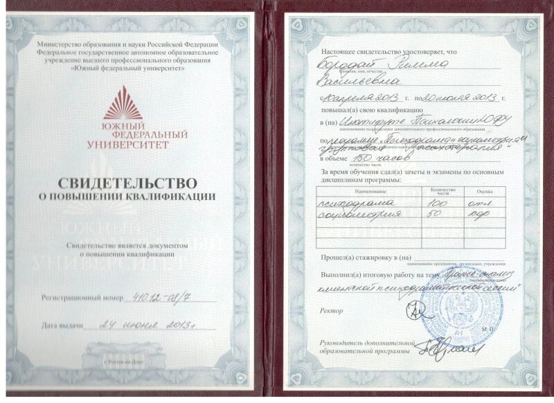 - Институт психологии ЮФУ, программа «Психодрама и социометрия и групповая психотерапия», 2013 г.