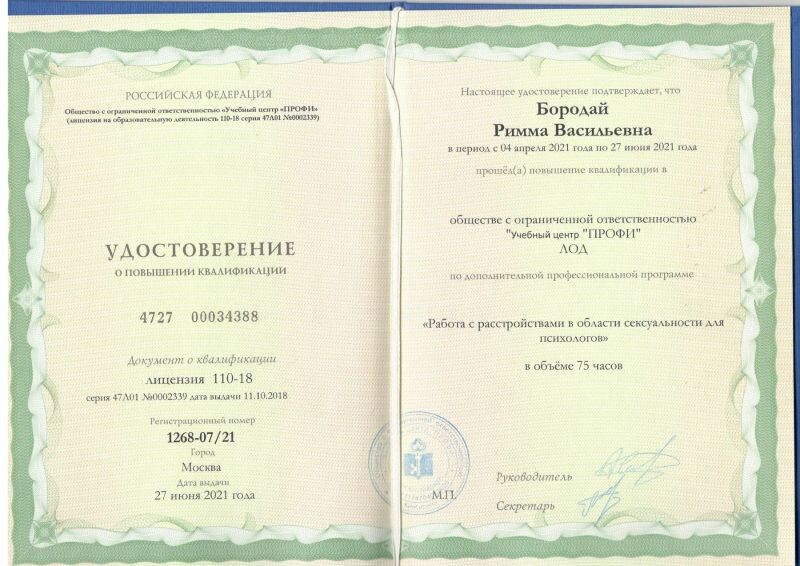 - Учебный центр «Профи», работа с расстройствами в области сексуальности для психологов, 2021 г.