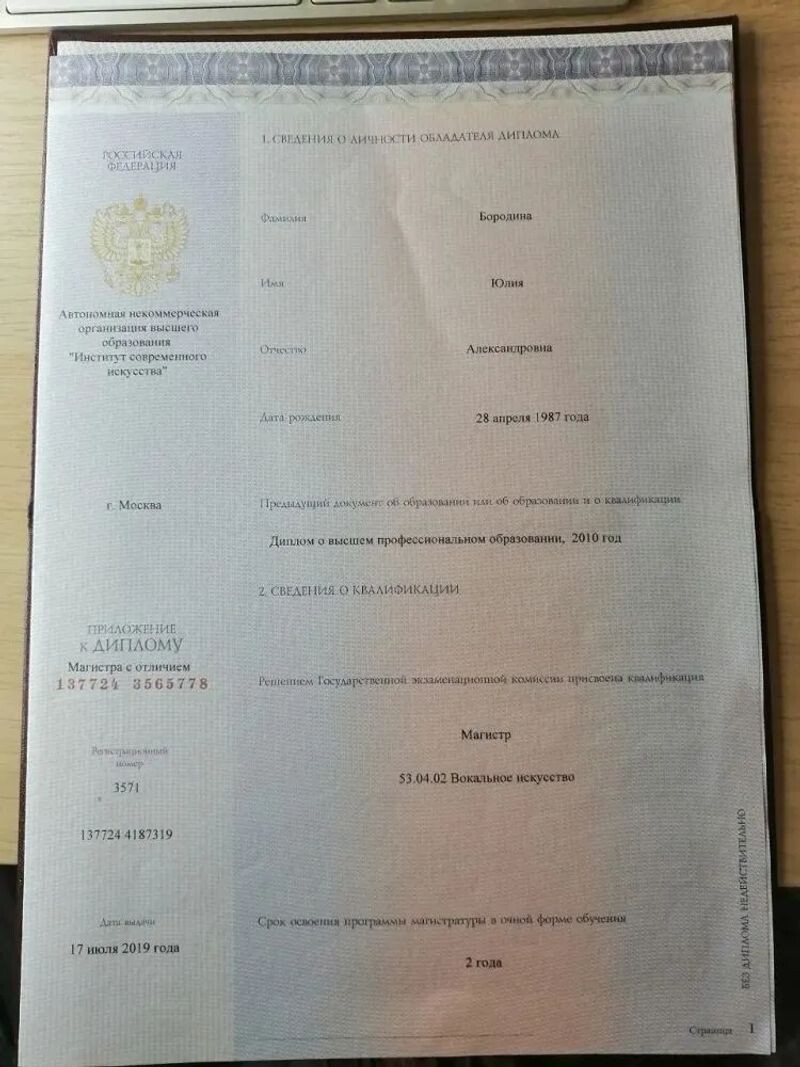 - Автономная некоммерческая организация высшего образования «Институт современного искусства», Вокальное искусство, магистр, 2017–2019 гг.