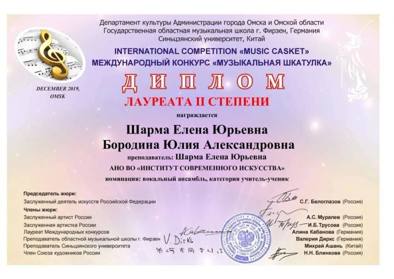 - Международный конкурс «Музыкальная шкатулка», Лауреат II степени в номинации — вокальный ансамбль, 2019 г.