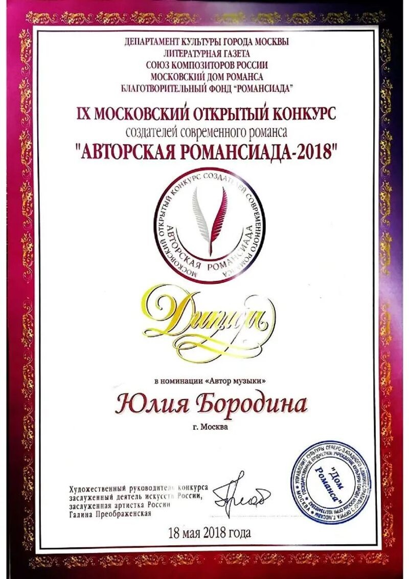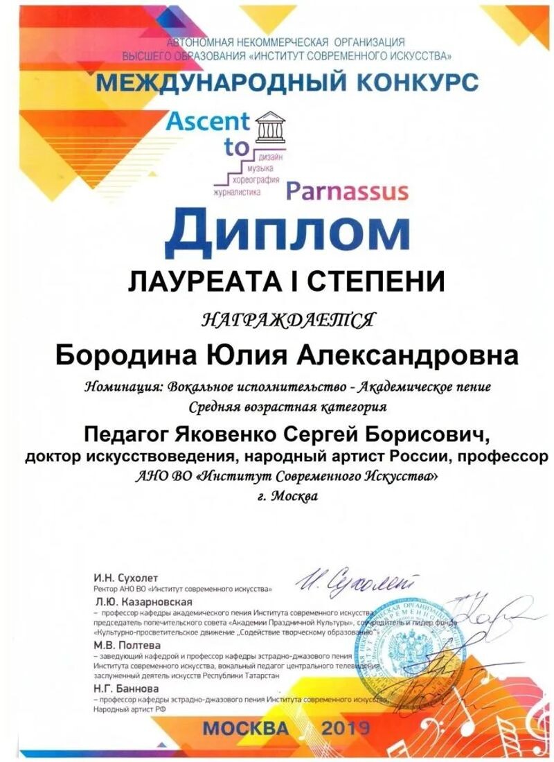 - Международный музыкальный конкурс «Ступень к Парнасу», Лауреат I степени в номинации — Сольное академическое пение, 2019 г.