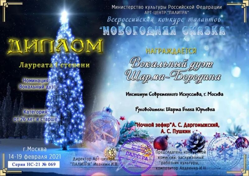 - Всероссийский конкурс талантов «Новогодняя сказка», Лауреат I степени в номинации — Вокальный дуэт, 2021 г.
