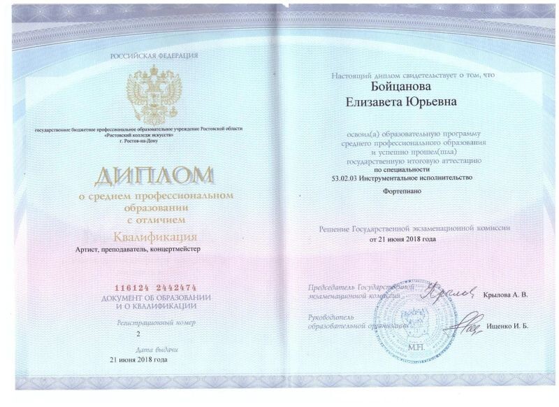 - Ростовский колледж искусств, инструментальное исполнительство, фортепиано, артист, преподаватель, концертмейстер, 2014–2018 гг.