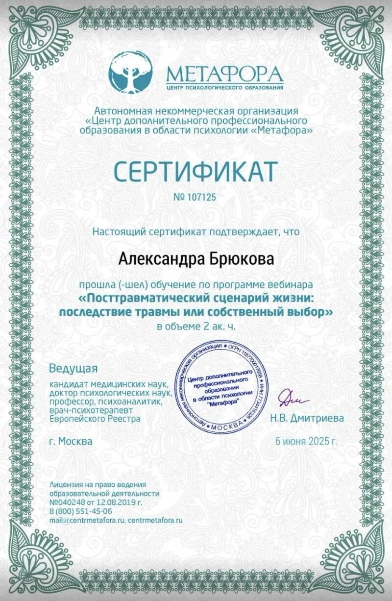 - Институт интегративной психологии «Метафора», посттравматический сценарий жизни: последствие травмы или собственный выбор, 2025 г.