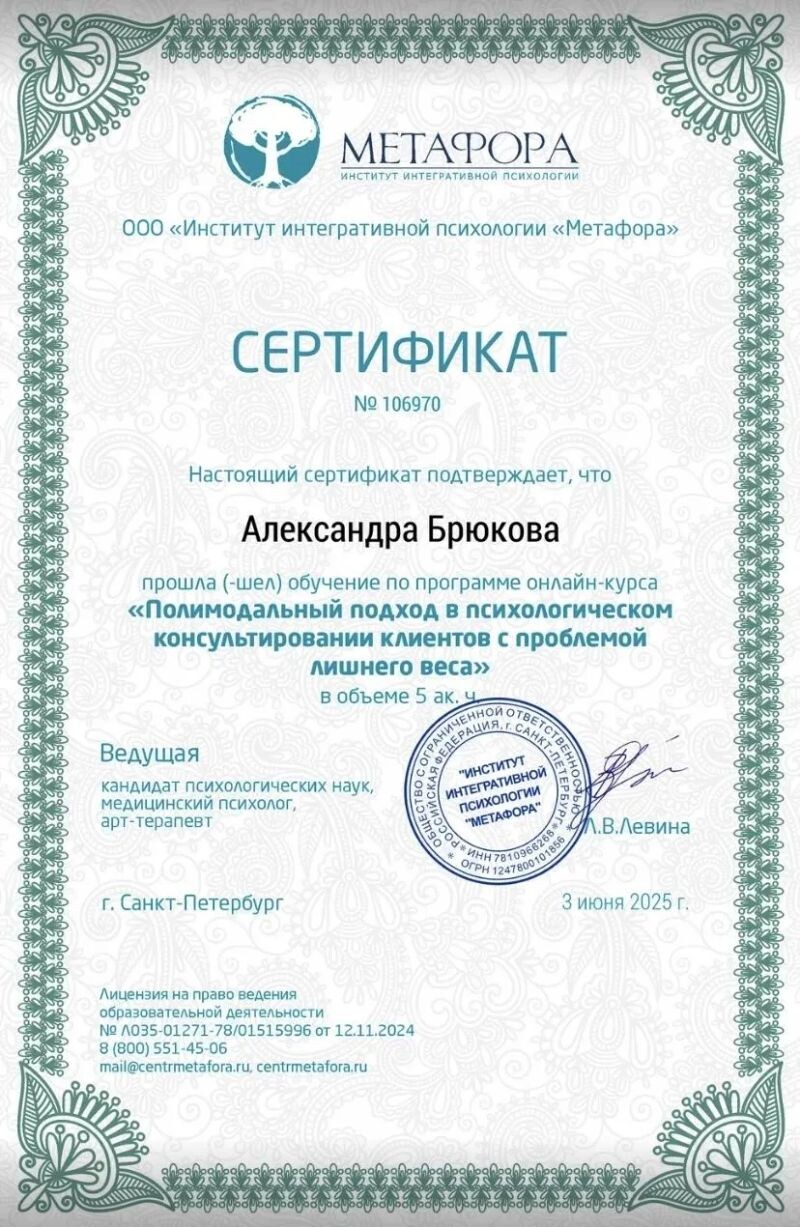 - Институт интегративной психологии «Метафора», полимодальный подход в психологическом консультировании клиентов с проблемой лишнего веса, 2025 г.