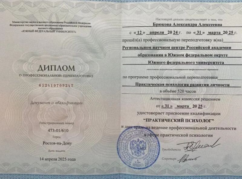 - ЮФУ, практический психолог, 2024–2025 гг.