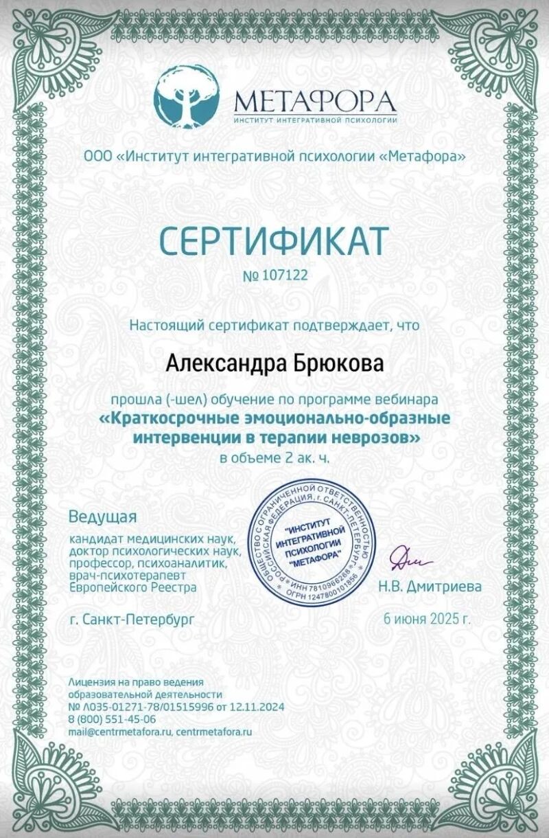 - Институт интегративной психологии «Метафора», rраткосрочные эмоционально-образные интервенции в терапии неврозов, 2025 г.