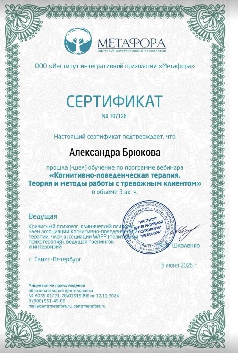 - Институт интегративной психологии «Метафора», когнитивно-поведенческая терапия, теория и методы работы с тревожным клиентом, 2025 г.