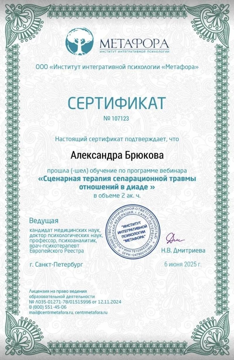- Институт интегративной психологии «Метафора», сценарная терапия сепарационной травмы отношений в диаде, 2025 г.