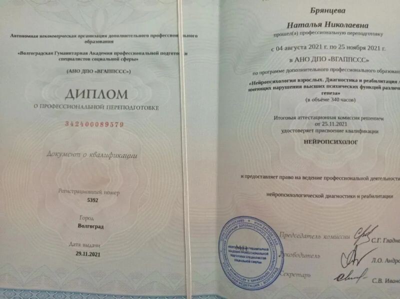 - АНО ДПО Волгоградская гуманитарная академия профессиональной подготовки специалистов социальной сферы , нейропсихолог, 2020–2021 гг.