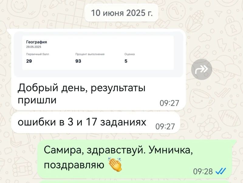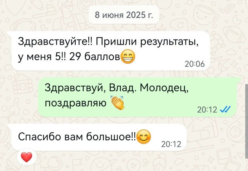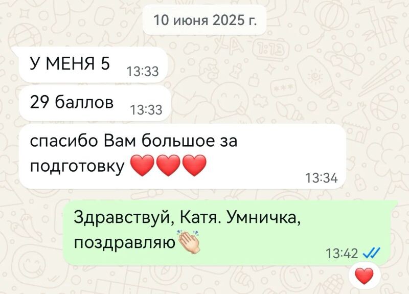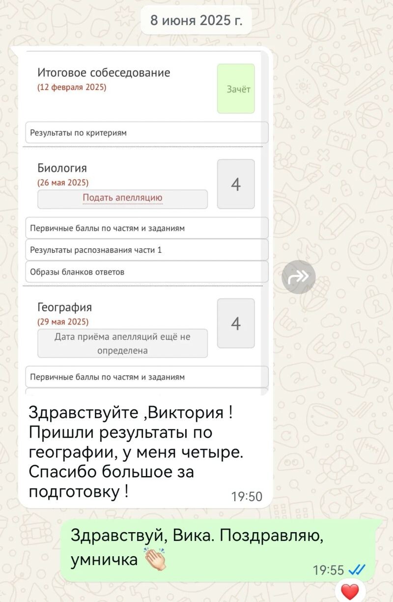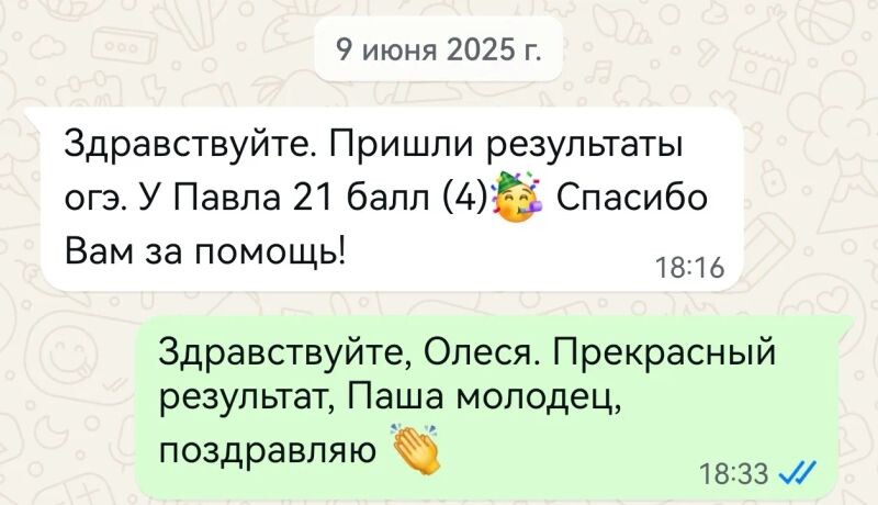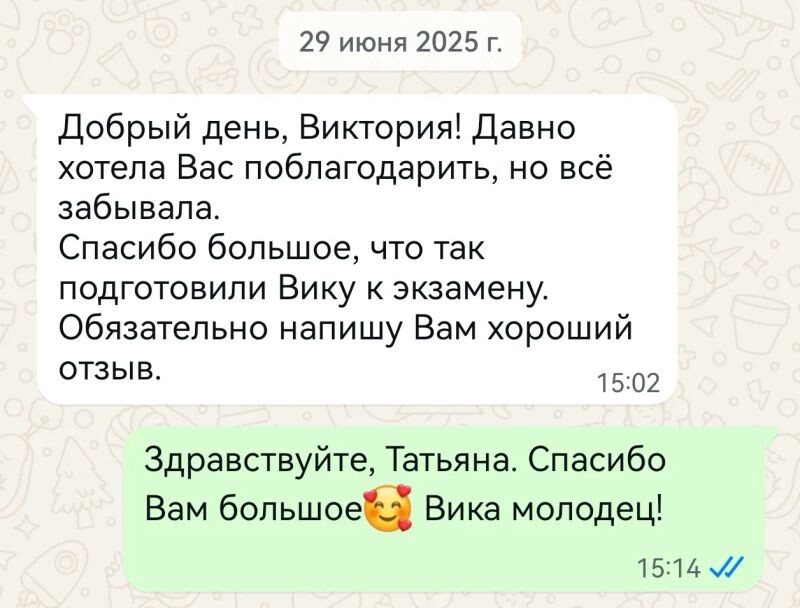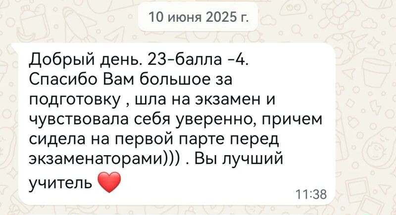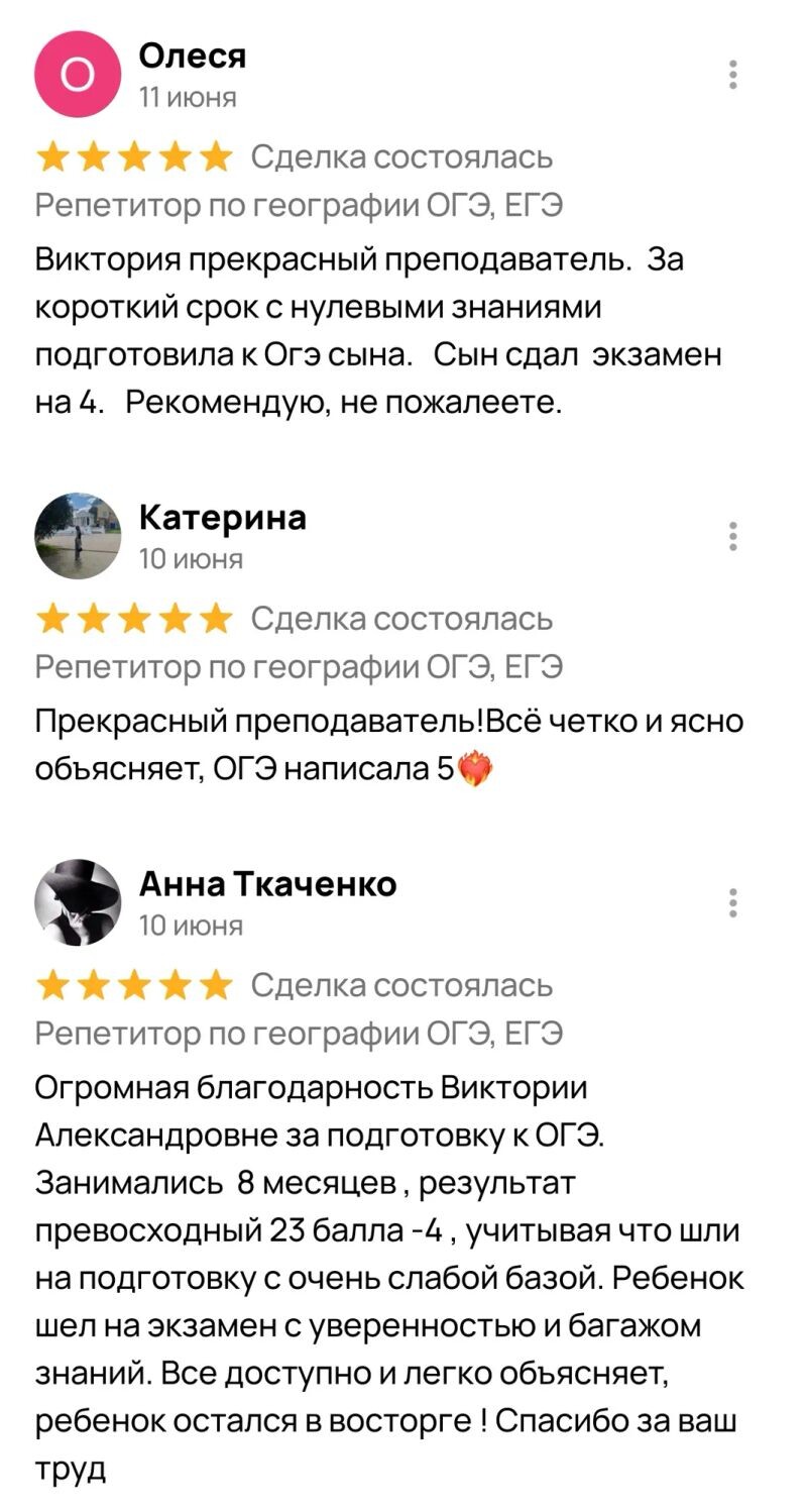 Доброжелательный педагог.С первого занятия ,с первой минуты сразу перешли к разборам вопросов к ОГЭ, все четко, без «воды»,дочери понравилось.6 июня 2024 дополняю отзыв по результатам ОГЭ ,дочь получила 5!Спасибо большое ,Виктория!