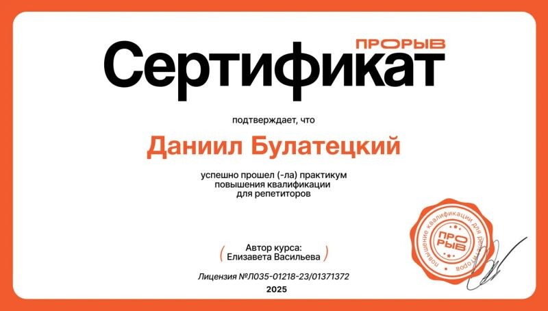 Репетитор заботливый, с полной преданностью относящийся к своему предмету. Он понятно объясняет все материалы. Мой ребенок улучшил свои знания и сделал огромный шаг вперед. Мы очень благодарны Даниилу Олеговичу.