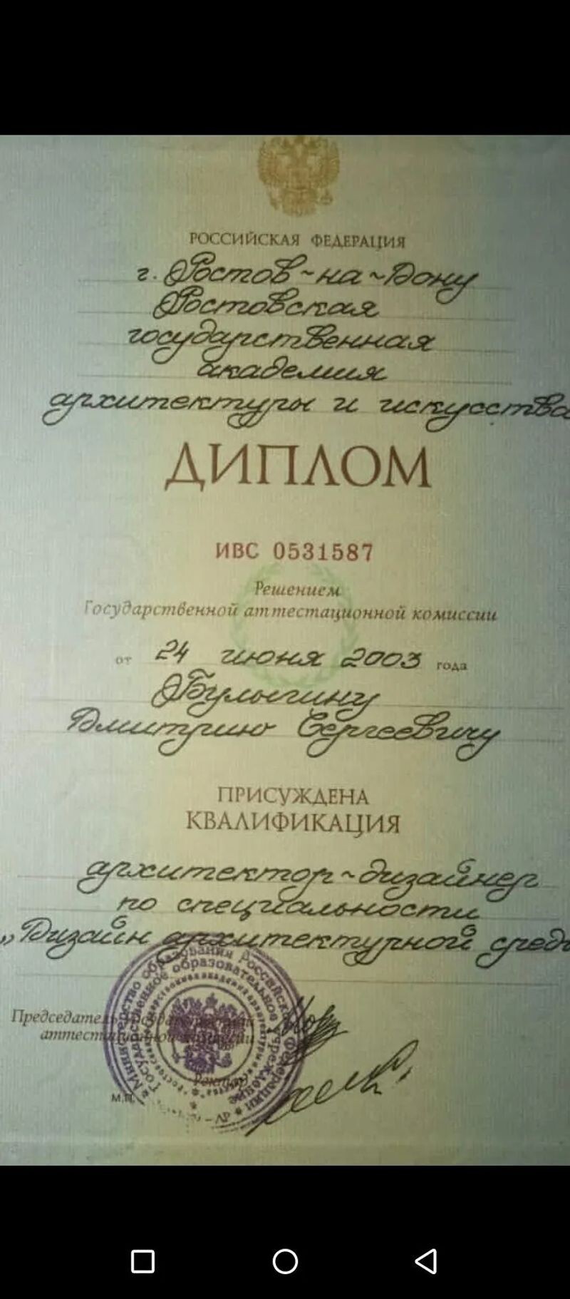 - Ростовская Государственная Академия Архитектуры и Искусства Факультет Архитектура Специализация ДАС ( Дизайн Архитектурной Среды ), 1997–2003 гг.
