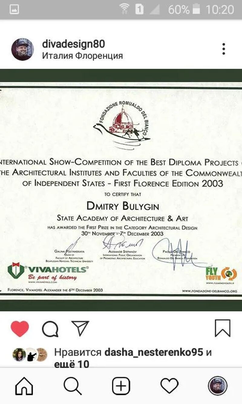 - Первый Приз на Международном Конкурсе во Флоренции Италия 2003 В номинации Лучший архитектурный Дизайн.