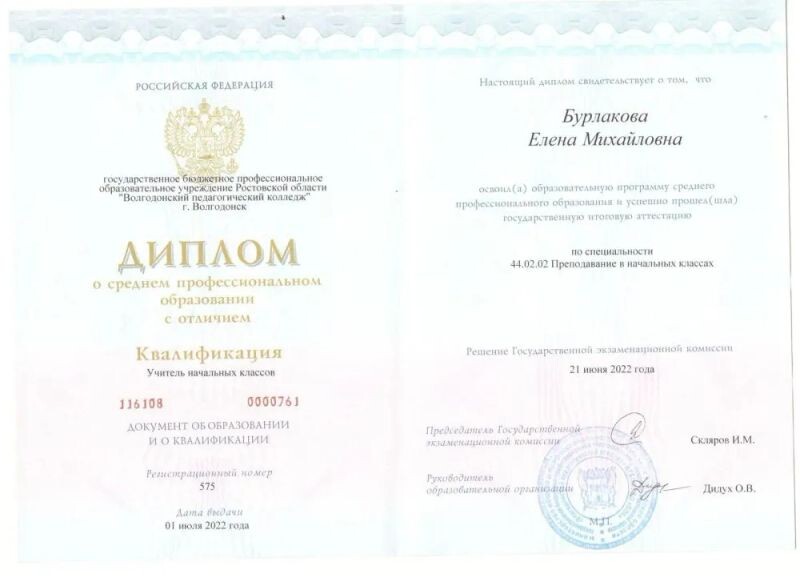 - Волгодонский педагогический колледж, преподавание в начальных классах, 2018–2022 гг.