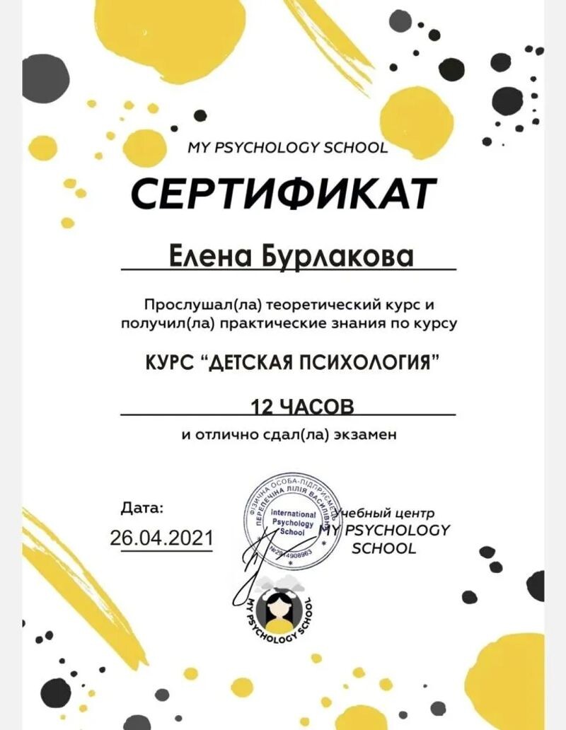 - Учебный центр My psychology school, курс «Детская психология», 12 ч, 2021 г.