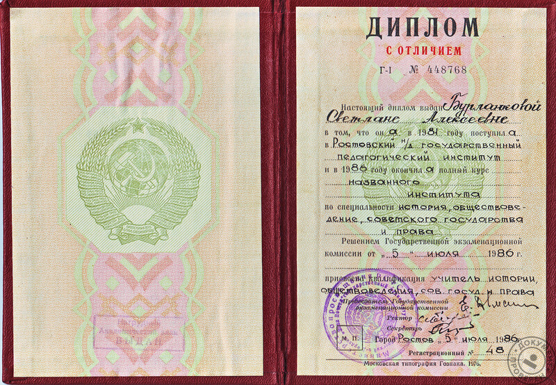 - Ростовский государственный педагогический институт, исторический факультет, квалификация – учитель истории, обществознания, 1981–1986 гг.