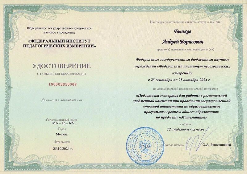 - ФИПИ (Федеральный институт педагогических измерений), подготовка экспертов для работы в региональной предметной комиссии при проведении государственной итоговой аттестации по образовательным программам среднего общего образования по предмету «Математика», 2024 г.