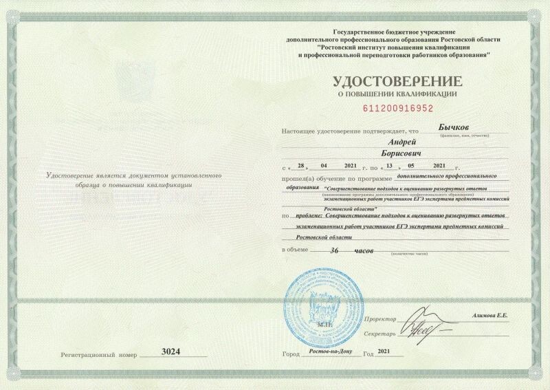 - Ростовский институт повышения квалификации и профессиональной переподготовки работников образования, совершенствование подходов к оцениванию развёрнутых ответов экзаменационных работ участников ЕГЭ экспертами предметных комиссий Ростовской области, 2021 г.