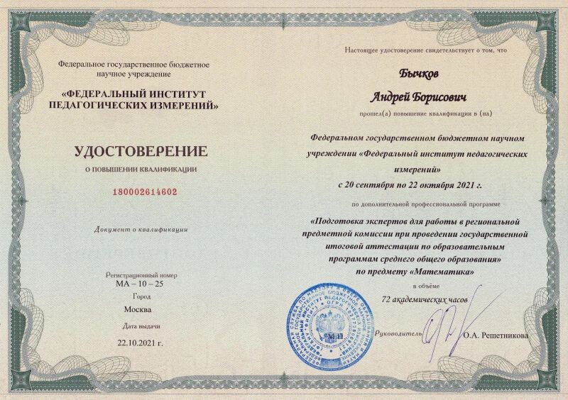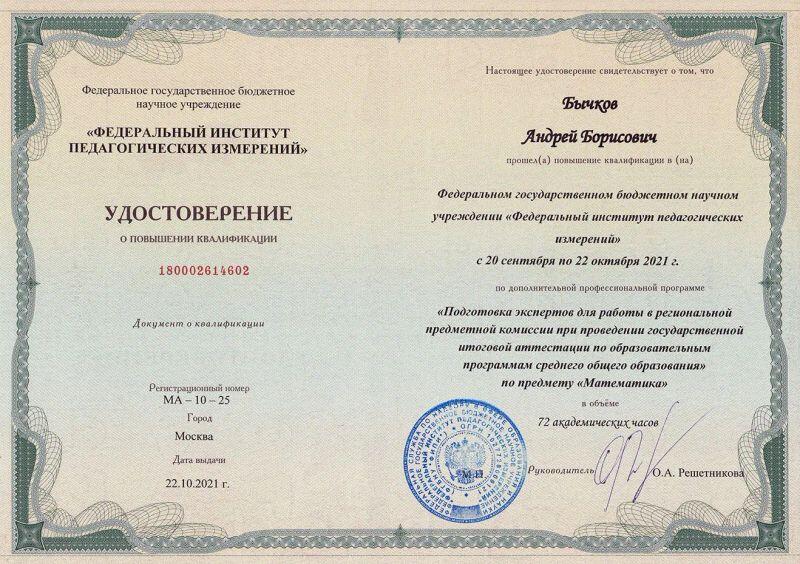 - Федеральный институт педагогических измерений, подготовка экспертов для работы в региональной предметной комиссии при проведении государственной итоговой аттестации по образовательным программам среднего общего образования по предмету «Математика», 2021 г.