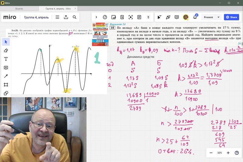 - Мини-группа 5000 - 9600 ₽ за мес.Подготовка к ЕГЭ (математика-профиль) в группах онлайн, 2 раза в неделю по 2,5 часа. У разных групп цели разные: от 70+ до 90+ баллов, предварительно протестируемся. Веб-камера не нужна, но наличие микрофона обязательно.