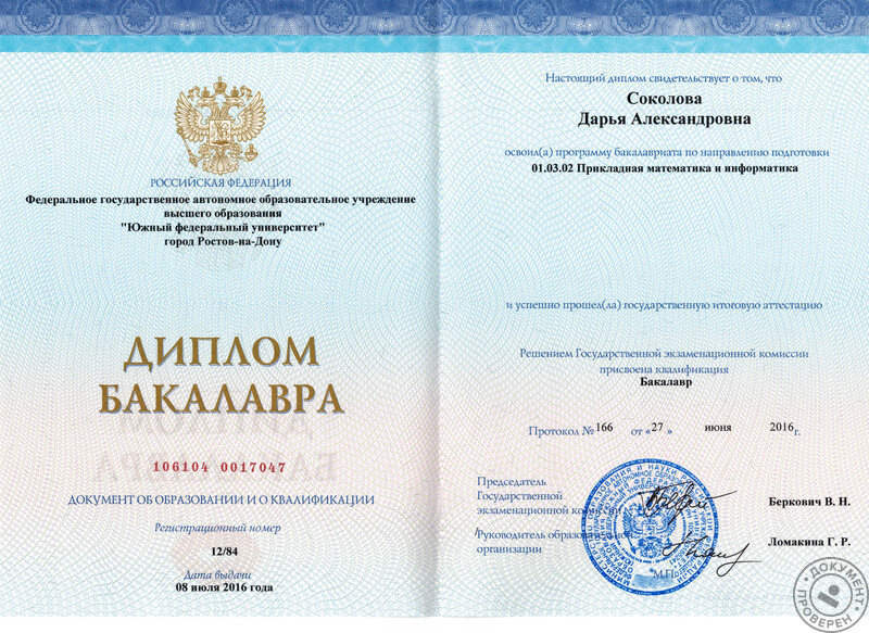 - Институт математики, механики и компьютерных наук им. И.И. Воровича ЮФУ, отделение прикладной математики и программирования, кафедра исследования операций, специальность – бакалавр прикладной математики и информатики, 2016 г.